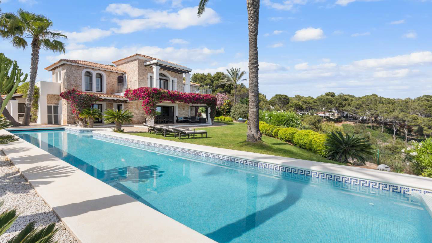 The Mediterranean-style villa in Cala Llenya offers premier luxury with world-classamenities. Located front line to the sea, it features a lush Mediterranean garden and easy beach access.